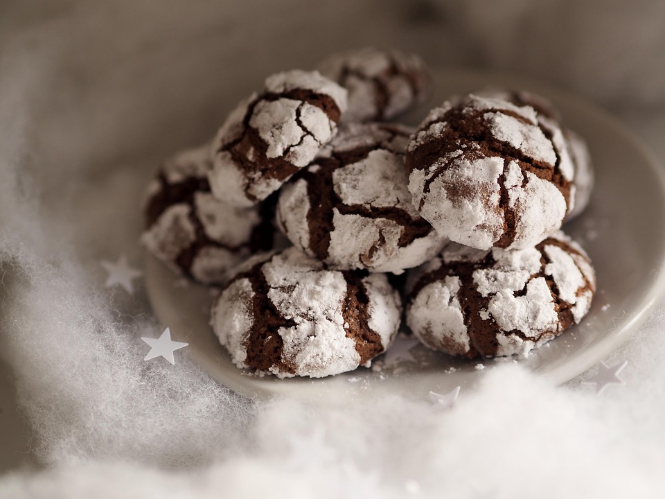 Chocolate crinkle cookies dusted with powdered sugar on a plate.