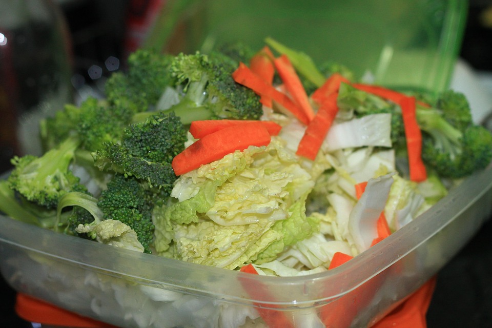 Fresh mixed vegetables in a container, including broccoli, carrots, and cabbage.