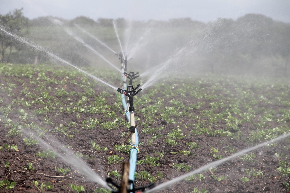 Sprinkler system irrigates green farm crops efficiently.