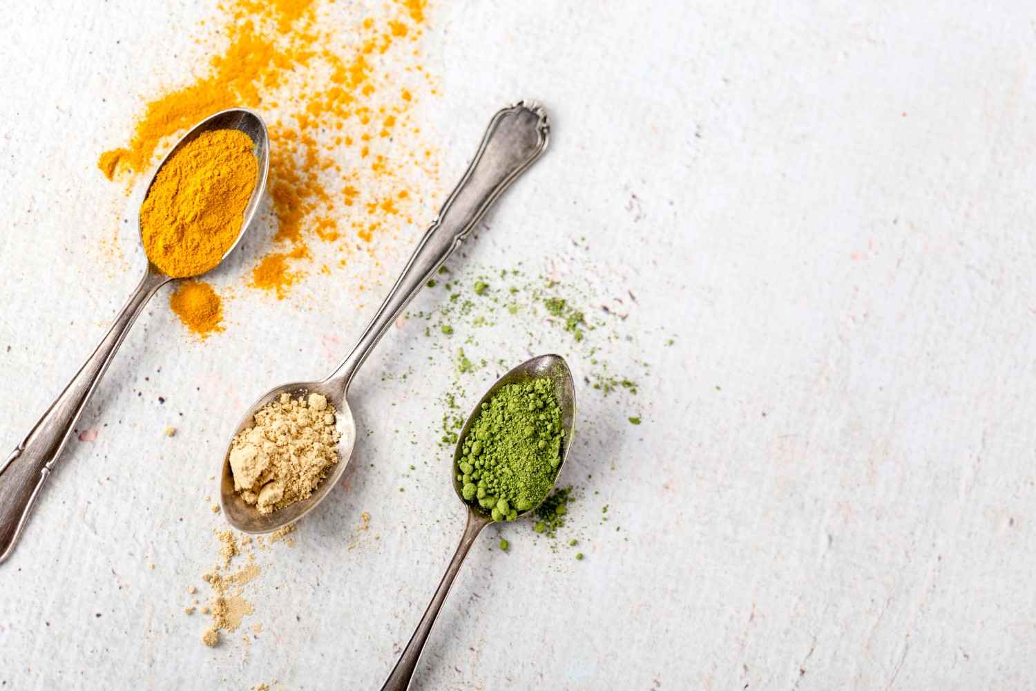 Spoons with turmeric, ginger, and matcha powder on a white background.